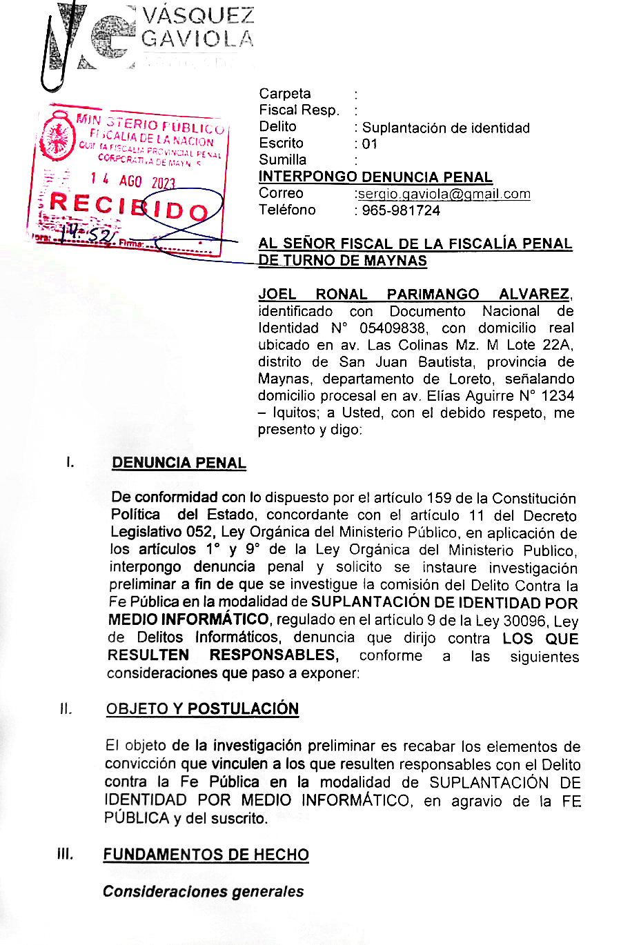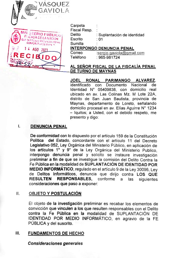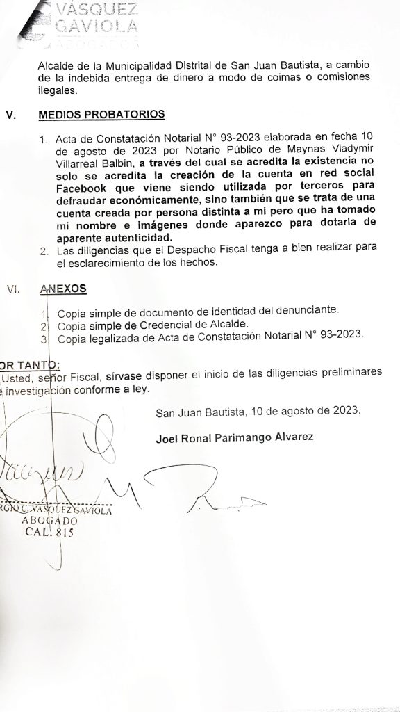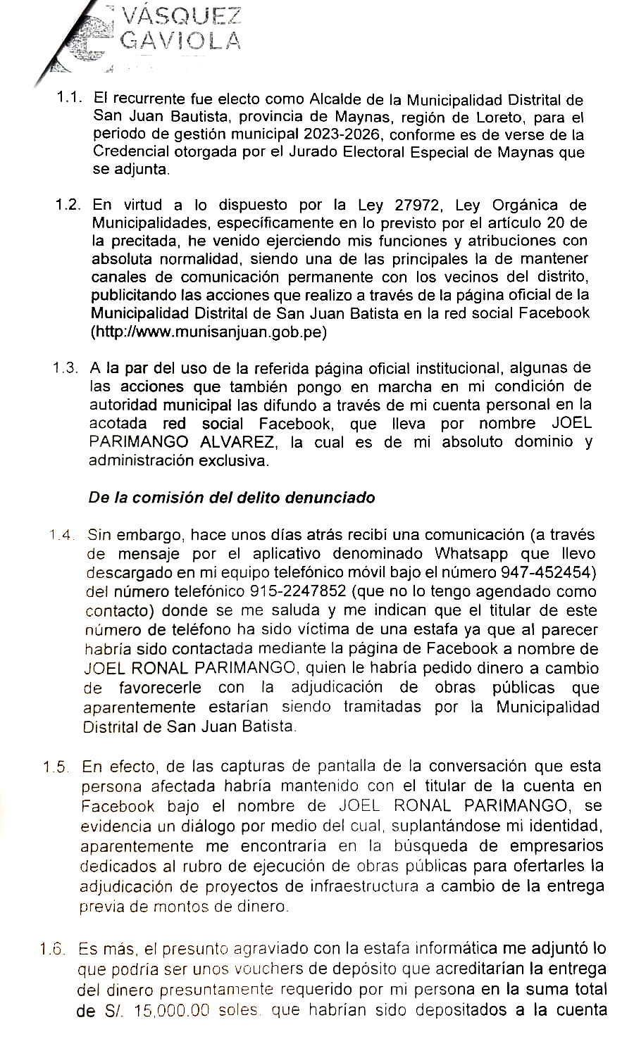 Completamente indignado se encuentra el alcalde de San Juan Bautista, Dr. Joel Parimango Álvarez, pues ha interpuesto denuncia penal ante el Ministerio Público por el delito de Suplantación de Identidad en agravio a la Fe Pública, esto luego de que varios ciudadanos refieren haber sido contactados por una cuenta de la red social facebook que lleva por nombre Joel Ronal Parimango, suplantando el nombre del alcalde sanjuanino, y haber hecho depósitos de dinero a cambio de ser favorecidos por obras.