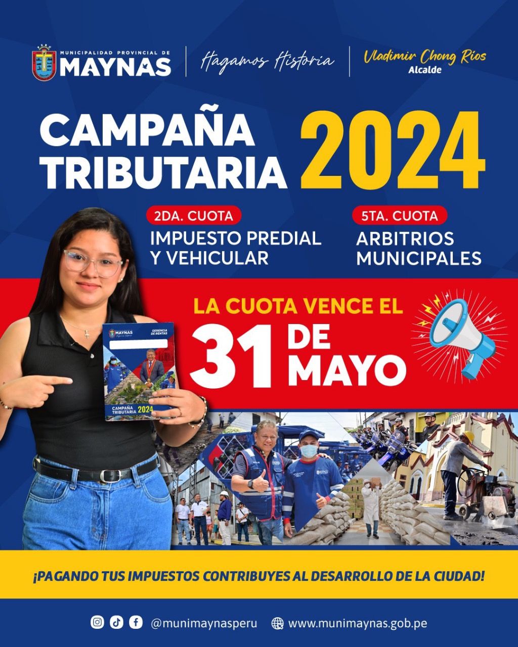 Con el objetivo de contribuir a la mejoría de la ciudad y por disposición del alcalde Vladimir Chong, la Gerencia de Rentas de la Municipalidad Provincial de Maynas hace un llamado a todos los ciudadanos a cumplir con el pago de sus impuestos prediales.