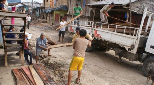 Con el propósito de no generar gastos a los vecinos, la Municipalidad de Punchana a través de camiones viene llevando y entregando cantoneras, viga, solera, caibros y clavos, al mismo lugar de las inundaciones.