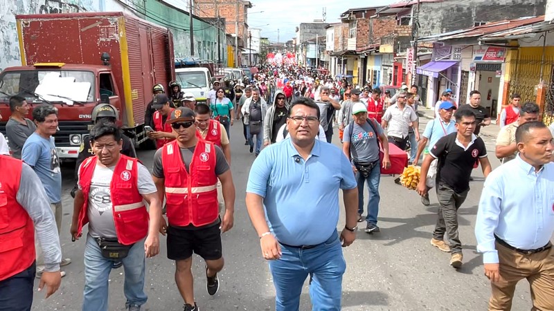 César Vidaurre, el Gordito Vidaurre, estuvo en la calle junto al Sindicato de Construcción Civil de Loreto, acompañando la movilización que partió desde la plaza 28 de Julio hasta Electro Oriente y luego a Petroperú. No fue un saludo protocolar: fue presencia política en una protesta con reclamos claros y urgentes.