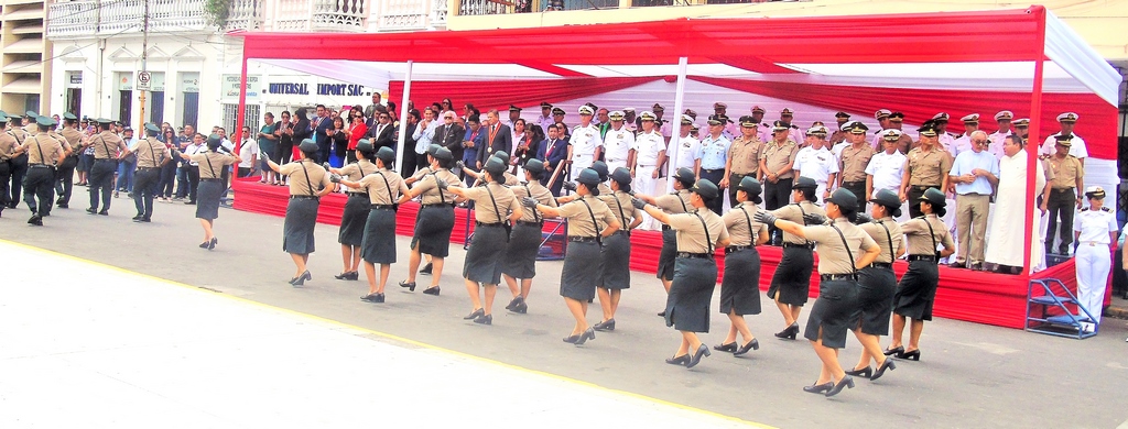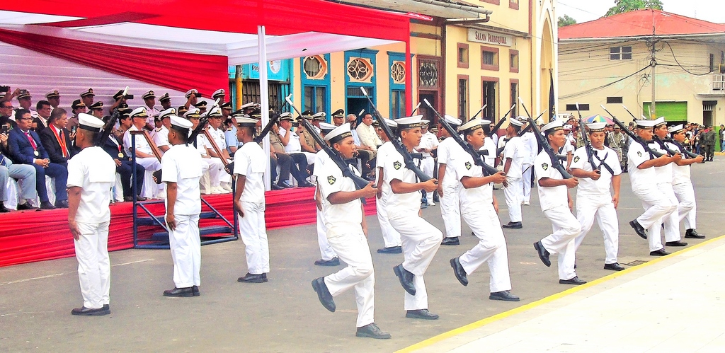 El padre Agustín Arévalo, capellán de la Marina, hizo la paraliturgia antes del discurso del alcalde y el desfile correspondiente. El desfile empezó con el grupo acrobático denominado “BAP América”, jóvenes grumetes que con gracia y garbo hacían diversas acrobacias que eran el deleite de los asistentes.