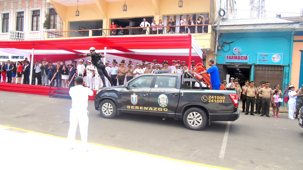 Llegó la hora del desfile cívico militar, no fue muy largo. Estuvieron grupos de trabajadores de la municipalidad de Maynas debidamente uniformados. Igualmente, los miembros del Serenazgo parecen haber aumentado y eso es vital para un mejor control en la ciudad.